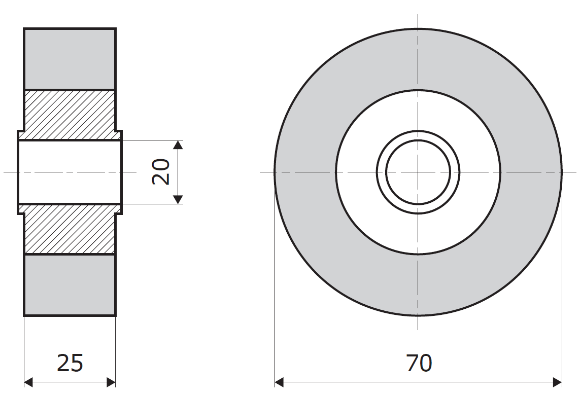 Die Rolle hat einen Polyamidkern und wird mit der weissen Gummimischung von 60±5 ShA gummiert. Der Gummi hat einen sehr guten Griff.