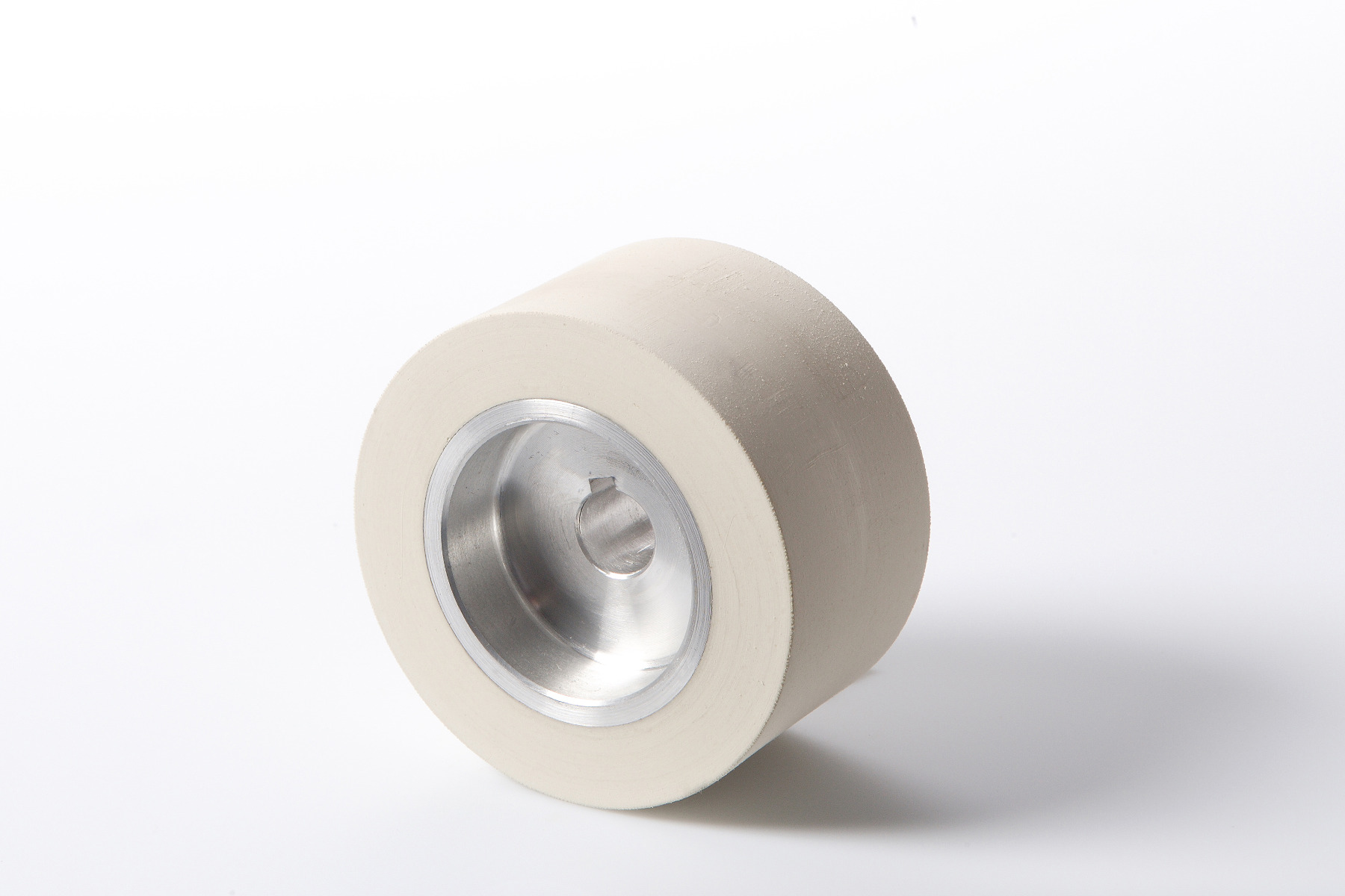 The feed roller has an aluminum core and is coated with a white rubber compound with a hardness of 60±5 ShA. The rubber offers excellent grip, leaves no marks, and is abrasion-resistant.