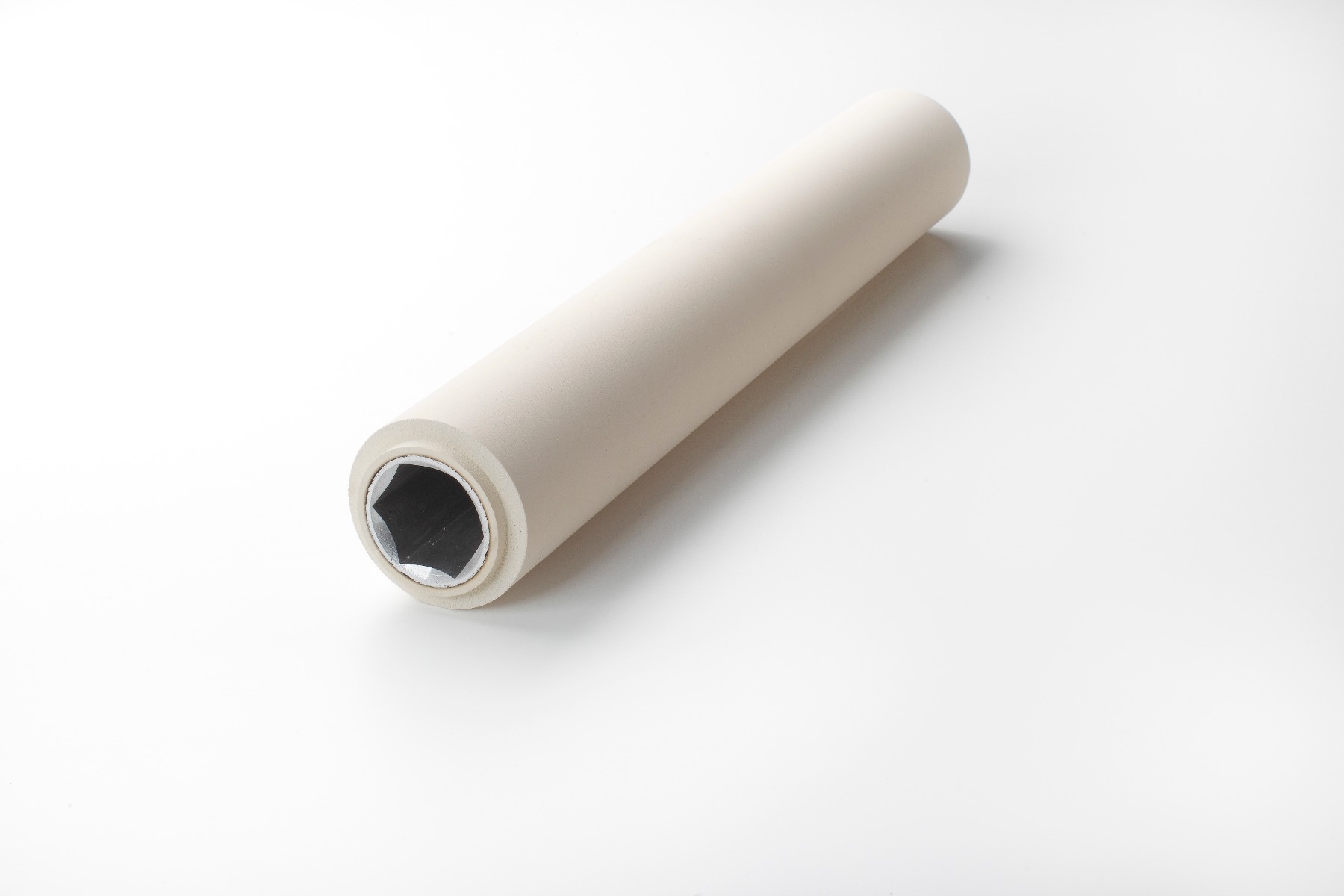 The roller has an aluminum core with a hexagonal bore and is coated with a white rubber compound of 60±5 ShA. The rubber offers excellent grip, leaves no marks, and is abrasion-resistant.