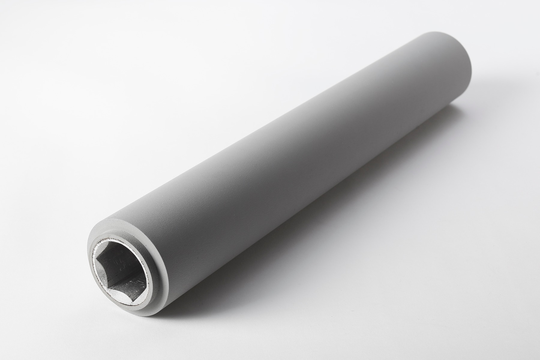 The roller has an aluminum core with a hexagonal bore and is coated with a gray rubber compound of 65±5 ShA. The rubber provides excellent grip and does not leave marks.
