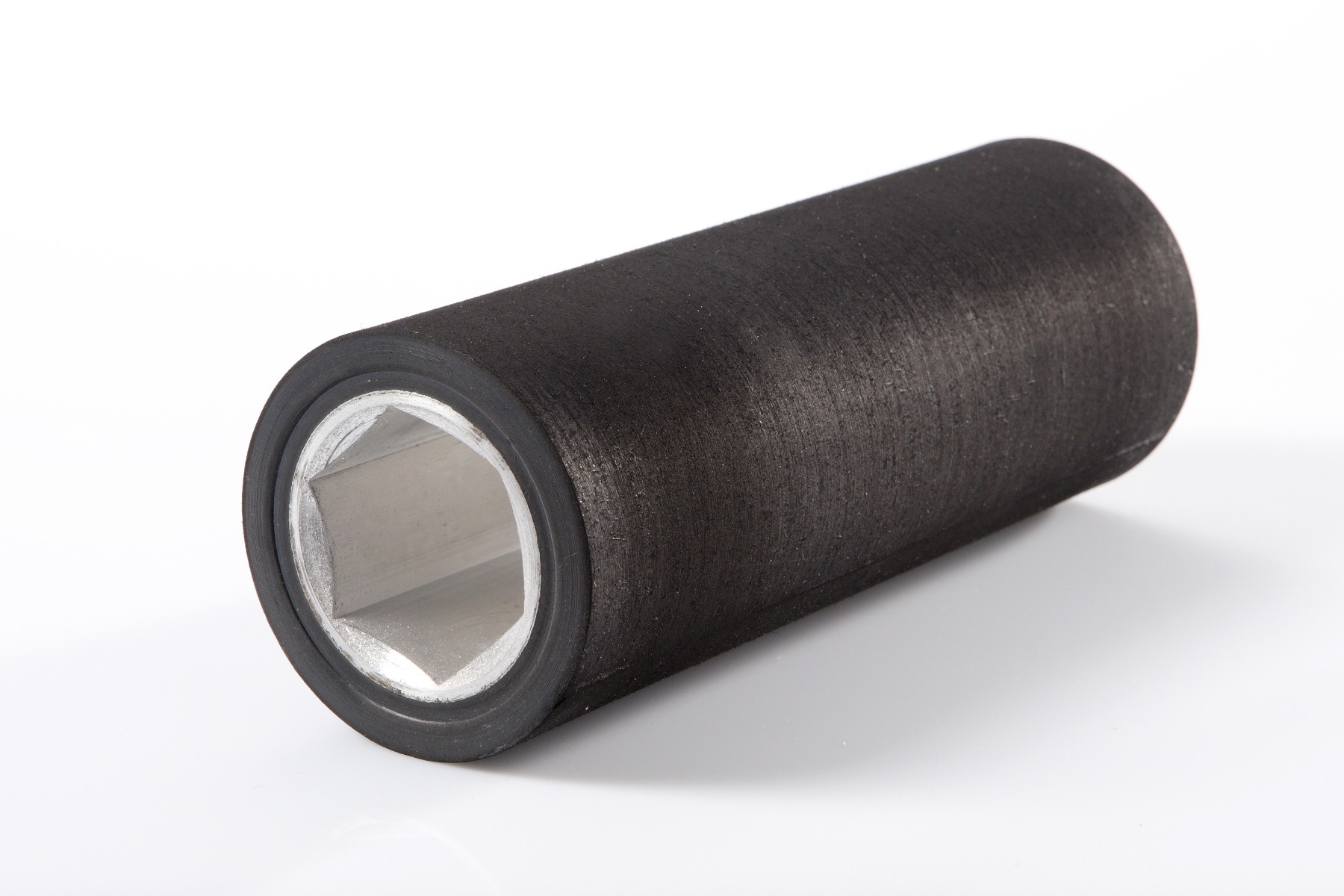 The roller has an aluminum core with a hexagonal bore and is coated with a black rubber compound of 70±5 ShA. The rubber provides excellent grip but can leave marks on the material.