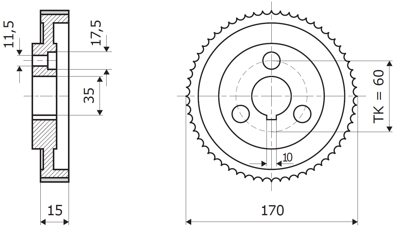 TK (fixing screw hole centers) = 60